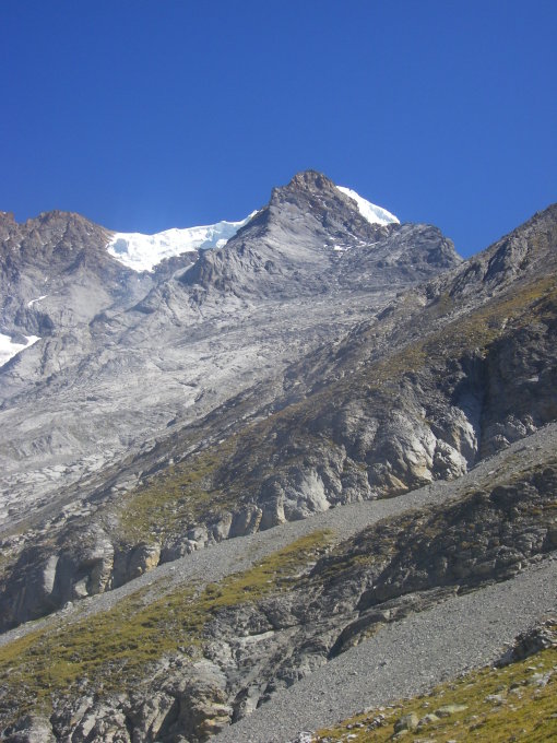 Nach dem zweiten Seil über leichtere Gneisfelsen zuerst leicht links dann rechts (E) haltend empor (z.T. viel loses Gestein!).