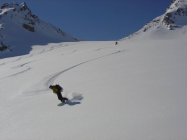 Abfahrt: Vom Skidepot auf R. 548c über den Jörigletscher bis an das südliche Ufer des Jörisees (ca.2490m). Nun nach SW zum Seelein P 2571, und rechts abbiegend gelangt man durch eine kleine Talmulde in die kleine Gratlücke südlich von P. 2771. Schöne Firnabfahrt durch das Müllersch Tälli nach SW zur Passstrasse und nach Tschuggen.