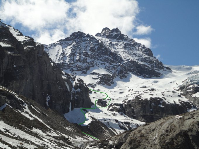 Man folgt vom Parkplatz der Rosenlauischlucht dem blauen Wegweiser zur Dossenhütte, wo man bei 1487 die Schlucht über eine Brücke traversiert. Richtung Westen durch den Wald auf 1680 hoch und dann nach Süden ins Gletscherhubel. Man folgt dem Talboden, bis man nach links auf eine Moräne aufsteigen kann (meist über Lawinenkegel) und folgt dem Moränenrücken bis zu seinem Ende an einer Felswand. An dieser nach rechts halten und entweder über das erste oder zweite Couloir gleich links hoch. Sobald es wieder etwas flacher wird nach Osten (links) haltend zum bereits sichtbaren Rosenlauibwak.