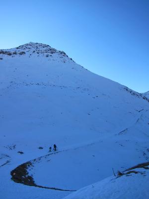 normale Skitourenausrüstung, ev. Steigeisen, Pickel