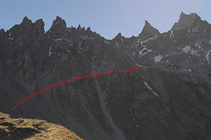 Schwierigkeit: T4, pfadlos, zu Beginn wenige alte, rotweisse Markierungen.
