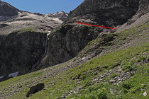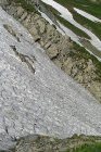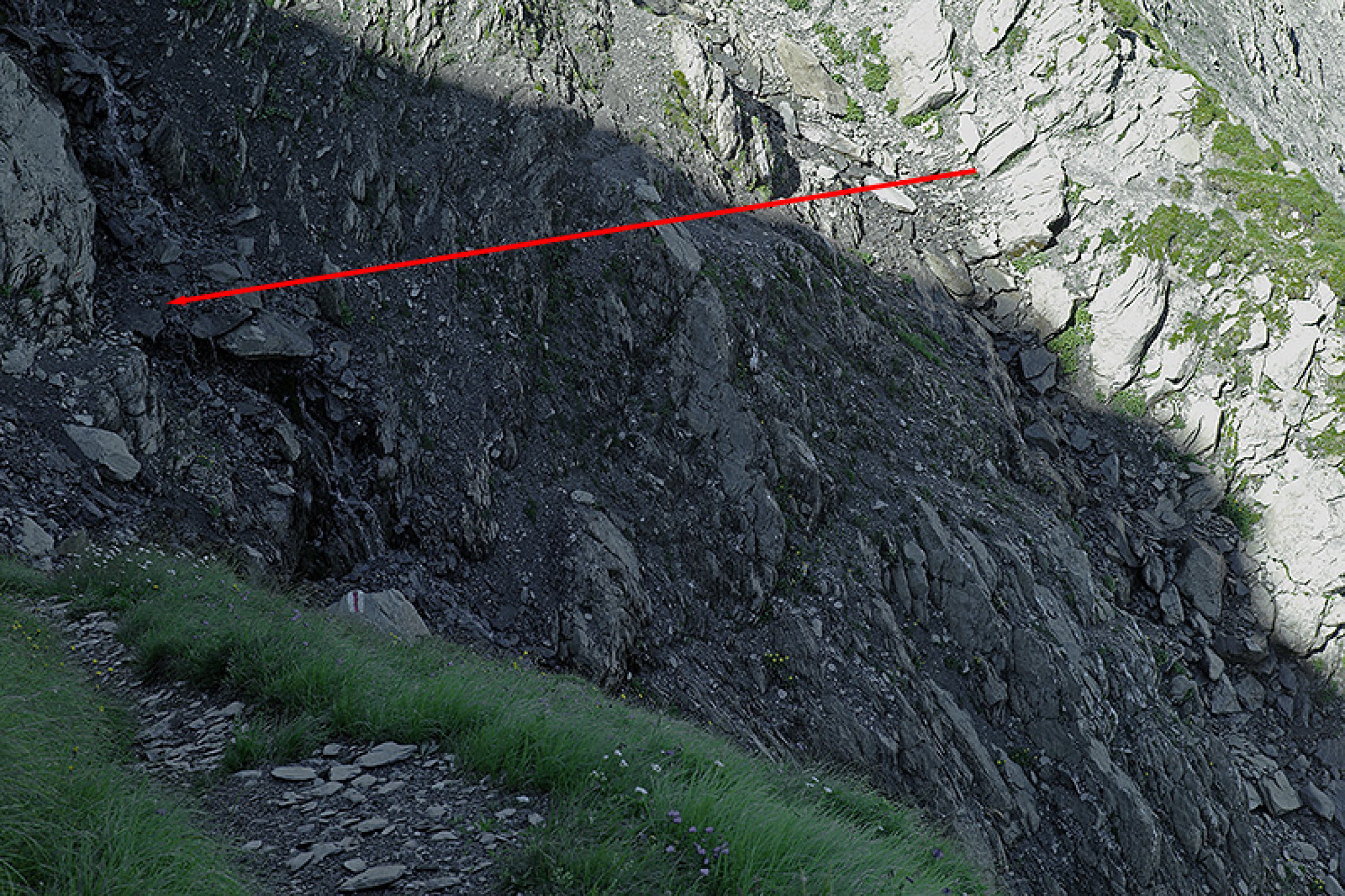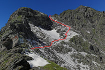 Bei Vorhandensein von Hartschnee ist die Querung jedoch äusserst heikel - nach durchschnittlichen Wintern sind dafür bis gegen Ende Juni meist zwingend Steigeisen erforderlich. Experimente sind hier tabu, jeder Rutscher endet unausweichlich den Gesetzen der Schwerkraft folgend 100 Meter tiefer im Geröll! Liegt Hartschnee, ist es deshalb meist sicherer, anstelle der Querung den gesamten Anstieg über die Rinne zu vollziehen.