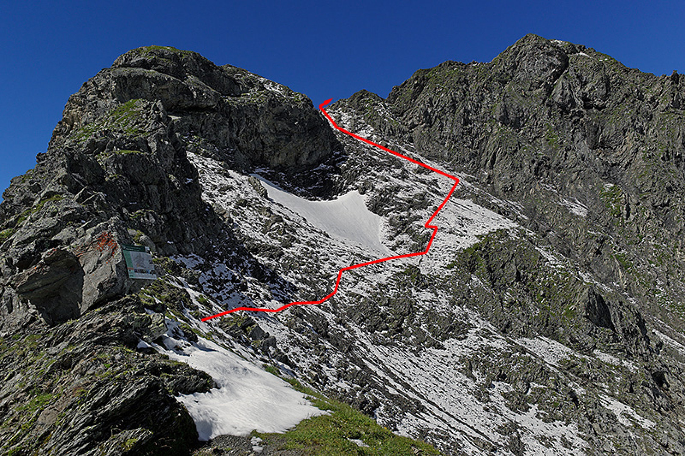 Der untere, felsige Teil des Grates lässt sich mit einem Höhenverlust von 50 Metern auch südseitig in Gras und Schutt umgehen.