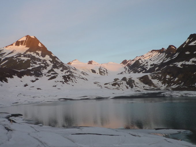 Vom Nufenenpass 2498m zum Griessee dann je nach Schneebedingungen links oder rechts am See vorbei auf den Griessgletscher. Weiter den Gletscher hinauf bis zu der gut Sichtbaren Spaltenzone. Diese links umgehen und linken Plateaurand weiter zum gut sichtbaren Gipfel des Blinnenhorn. Vor dem Blinnenhorn nach links und in einem Bogen bis zum Skitdepot oder Gipfel.