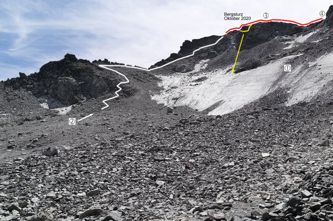 Die Stelle des Bergsturzes ist auf dem ersten Routenfoto eingezeichnet.