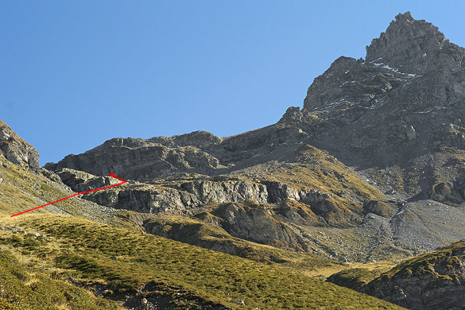 Schwierigkeit: T4, keine Markierungen, schwach erkenntliche Pfadspur, festes Schuhwerk und Spürsinn unbedingt erforderlich