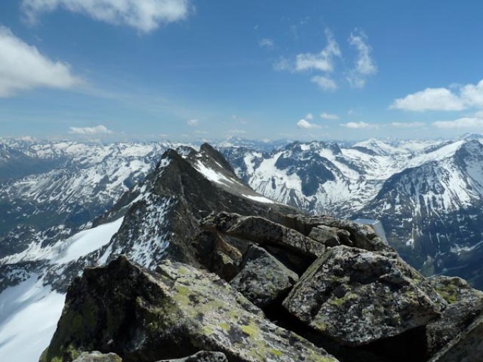 über den Südgrat zum Gipfel. Einstieg beim Punkt 2886, Abstieg über den Südostgrat bis zur Abseilstelle (Stahlschlingen), ein weiteres Fixseil (spröd!) verleitet zum Abseilen bis fast zum Punkt 3021