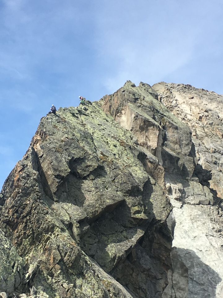 Der ca. 1km lange Zackengrat ist am Anfang einfach zu begehen. Gegen den Gipfel zu nehmen die Kletterpassagen (II-III) zu. Meist kann über Zacken gesichert und am kurzen Seil gegangen werden. Ein paar Keile und Schlingen sind sicherlich von Vorteil. Der originale Aufstieg auf den dritten Turm ist 2018 einem Felssturz zum Opfer gefallen (Bild 3). 10 m nach dem Gipfel des zweiten Turms muss nun an einem neuen Abseilstand in Richtung Rinne, welche den dritten Turm vom Gipfel trennt, abgeseilt werden (20 m, Bild 2). Hier zweiter Abseilstand. Nun hat man zwei Optionen. Entweder weiter abseilen in die Rinne (20 m) und diese in die Gipfelscharte aufsteigen (I-II, Bild 4). Oder anspruchsvoll auf Bändern in der Südwand des dritten Turms zu einem senkrechten Riß und diesen empor zum Originalweg (V, mobile Sicherungen notwendig).