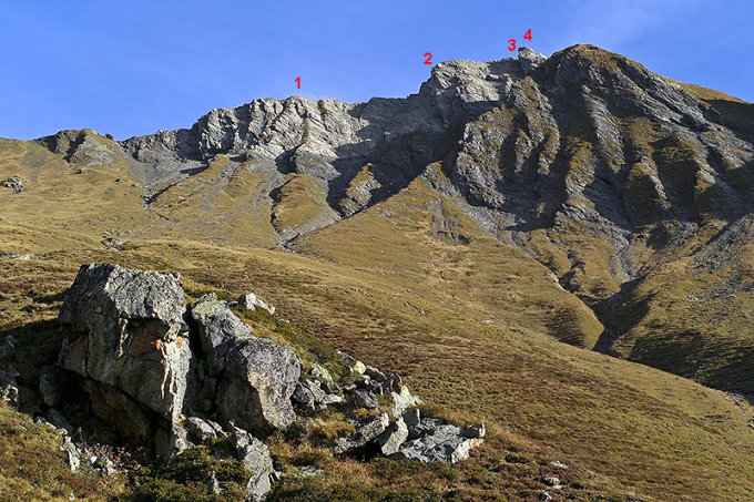 Den steilen Schlussaufschwung von knapp 50 Höhenmetern bewältigt man durch eine Umgehung über die abschüssigen, mit Schutt durchsetzten Felsstufen der Nordflanke. Den Grat erreicht man so wieder in Nähe des Nordgipfels, der sich nun problemlos in wenigen Schritten erreichen lässt.