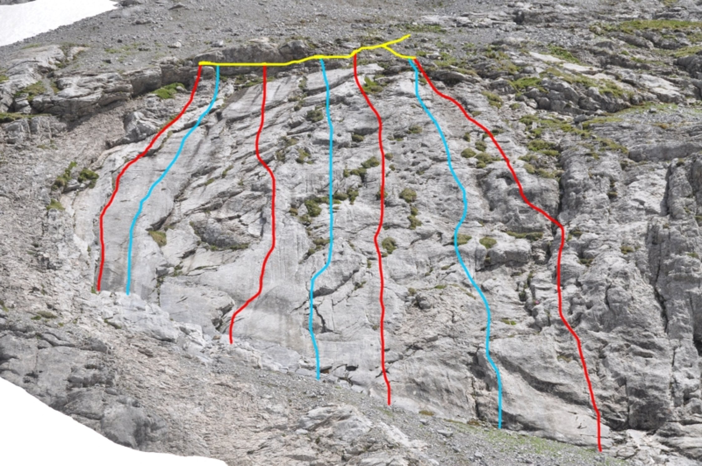 Von der [link:idg6953]Gspaltenhornhütte SAC[link] den Hüttenweg zurück zum Wegweiser und dem Moräneweg ca. 50m folgen. Über eine Felsstufe zu den Einstiegen.