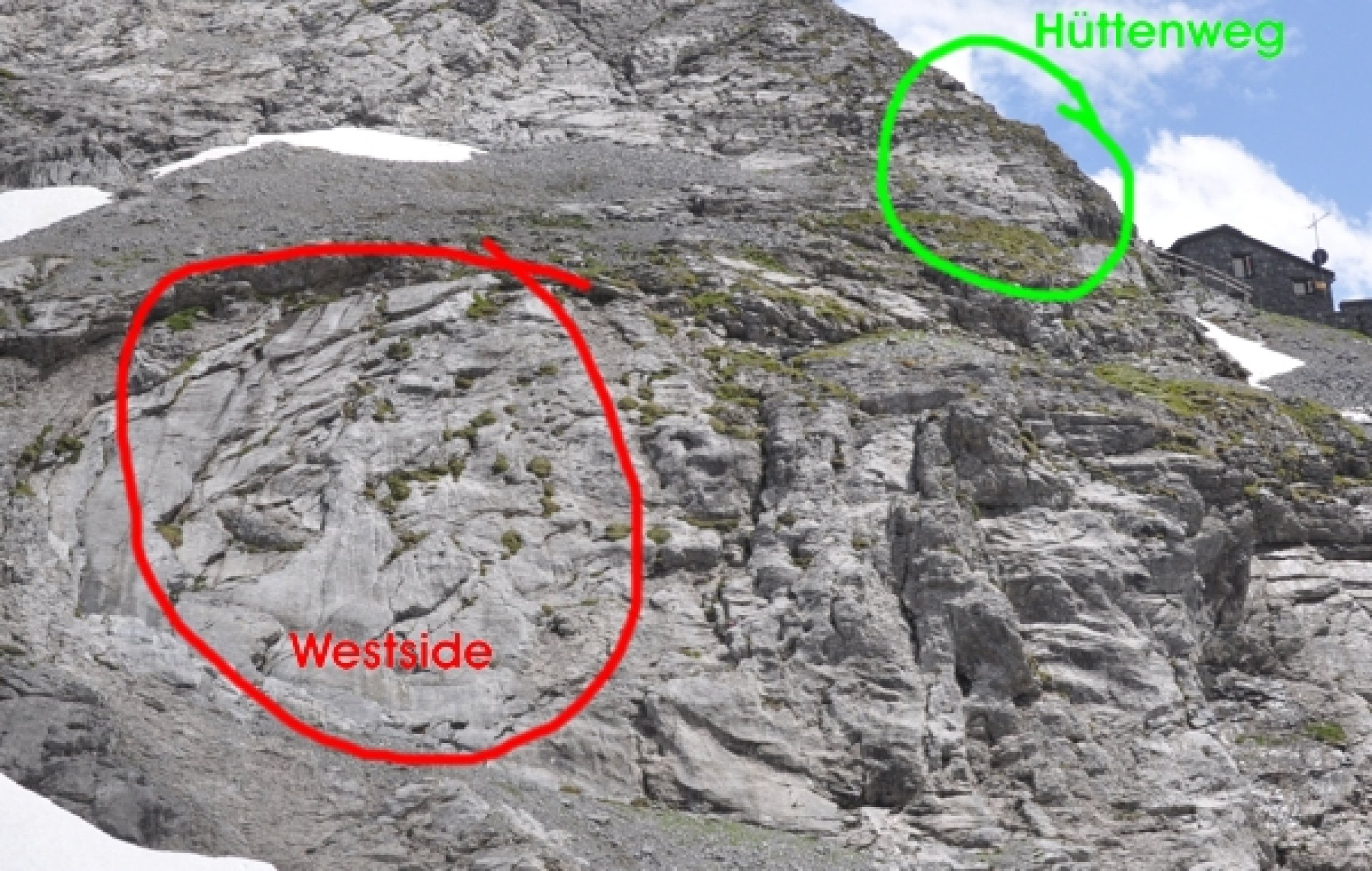 Die Felsplatte "Westside" befindet sich wenige Meter vor der Gspaltenhornhütte unterhalb des Hüttenweges. Mittlere bis steilere Plattenklettrei.