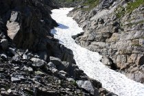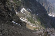 Schneebändli: Von der Graskuppe Alpelenhörnli steigt man kurz in den Sattel dahinter ab wo der eigentliche Aufstieg beginnt. Im Sattel steigt man auf einem grasigen Grätchen zu einer kleiner grasigen Felsstufe hinauf die man von links nach rechts überwindet und wieder auf ein Grätchen gelangt das in einem Geröllfeld endet. Oberhalb vom Geröllfeld geht das Gelände in ein feinkörniges, dunkles Kieselfeld über das zu einem Felsgürtel leitet. Man steigt durch das Kieselfeld etwas rechtshaltend hoch (zueltzt grasig) bis man auuf halber Höhe des Felsgürtels nach rechts um eine Kante etwas ausgesetzt in den Arni-Alpelengaben hineinqueren kann. Der etwa 35° steile Graben ist meistens mit Schnee gefüllt und man sollte sich wegen Steinschlaggefahr nur kurz darin aufhalten. Im Graben steigt man 80 Höhenmeter hoch (oder bei wenig Schnee sicherer in den plattigen linken Randfelsen). Anschliessend steigt man nach rechts hinaus und gelangt über Grasgelände hinauf zu den Arnibänder unter einem wilden Steilaufschwung. Unter dem felsigen Steilaufschwung quert man nach rechts über ein Geröllfeld auf den nächsten Grasrücken von dem man unter der Felswand 15m weiter quert. Über einen Grasrücken steigt man nun steil berauf zu einer kleinen Felswand an der man einen felsigen Kamin durchsteigt und in sehr steiles grasiges Gelände trifft. Hier hält man sich eher nach links Oben und gelangt so nach etwa 70 Höhenmeter hinauf zum Schneebändli. Man steigt nach links, möglichst direkt unter den Felsen, über das lange und stark geneigte Schutt- und Schneeband bis zu dessen Ende. Man betritt so den Sattel P.2589m in einer Geröllebene zwischen Schwarzhorn, Henglihorn und P.2655m. Die T5-Route weist Steilgras bis 60°, Kletterstellen bis II- und oft Firn bis 45°; Pickel und Steigeisen sind auch ohne Schnee (Spätsommer / Anfang Herbst) besonders im oberen Teil der Route zu empfehlen.