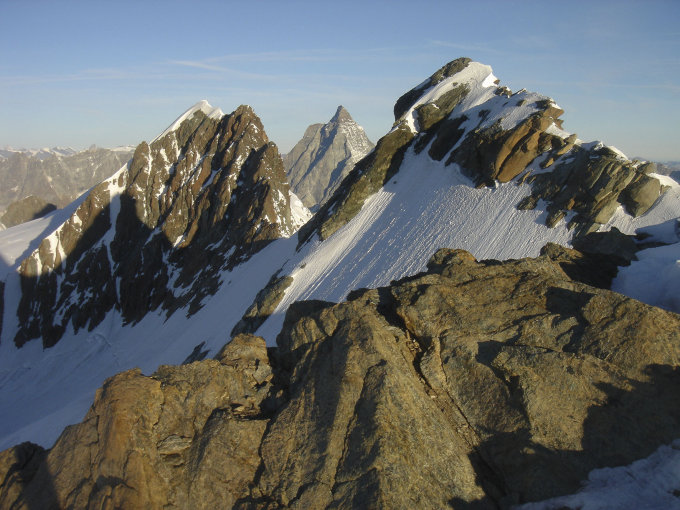 Abwechlungsreiche und genussreiche kombinierte Hochtour, die lohnende Kletterstellen in Fels und Firn bietet. Der erste Aufschwung vom Mittelgipfel kann direkt erklettert werden, was sehr lohnend ist, Fels 4a, teils alte Bohrhaken.