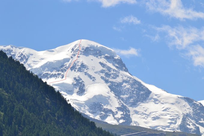 Über den Gletscher zum Firnhang hinauf. Diesen an der linken Seite bis zu einer wenig ausgeprägten Schneeschulter im Grat ersteigen (45°). Auf dem Grat im Firn (50°) zu den Felsen und diese in leichter Kletterei (II) überwinden. Dann nach links queren. Einen kurzen Hang zum Schneegrat (ca. 3580m) aufwärts.
