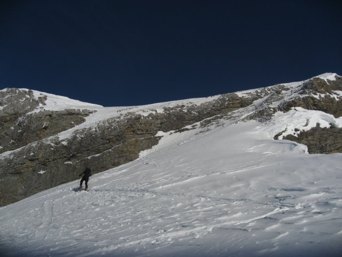 Den Steilhang zwischen Blüemberg und Chronenstock empor in den Sattel P 2348 (grosse Wächten!) und nach links unter die Felsen empor.