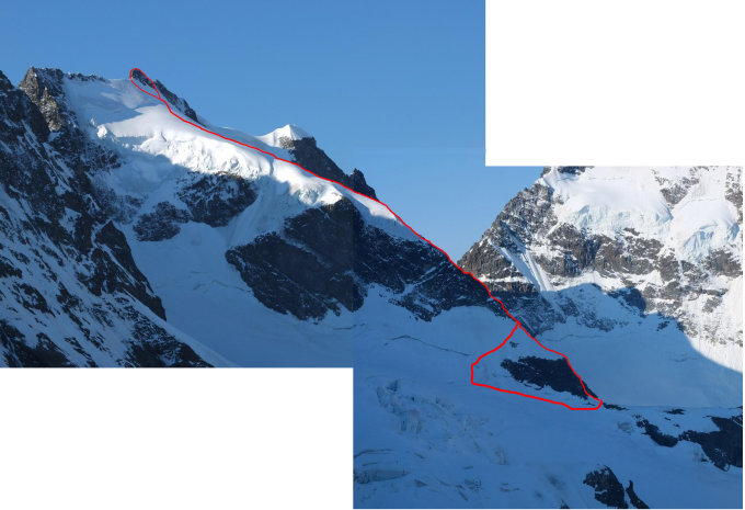 Vom Bohrhakenstand über dem ersten Aufschwung am besten 1x50m direkt auf den Gletscher abseilen.