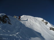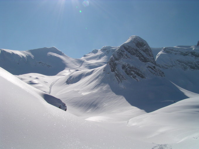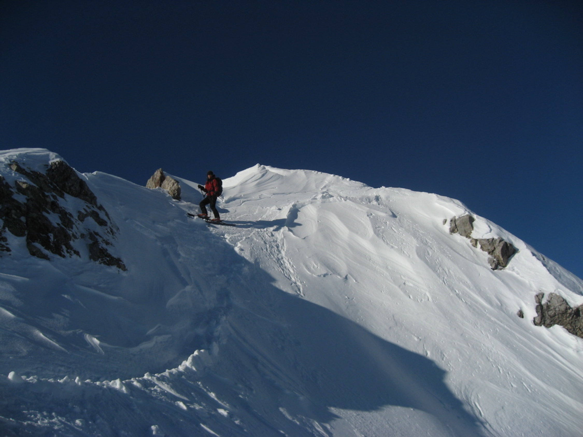 Die Gipfelfelsen nordwärts umfahren und in den Gipfelhang. Direkte Abfahrt rechts vom Rupperslauistöckli zum Rupperslauibödeli. Rechts am Achslenstock (Rettungsschlitten) vorbei durch die Achslenteufi abfahren und auf ca. 1800m rechts zu den Wasserböden (kleine Hütte und Stange) queren. Weiterqueren bis zur grossen Mulde, die in der Falllinie zum Ahöreli abgefahren wird.