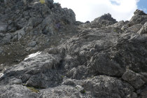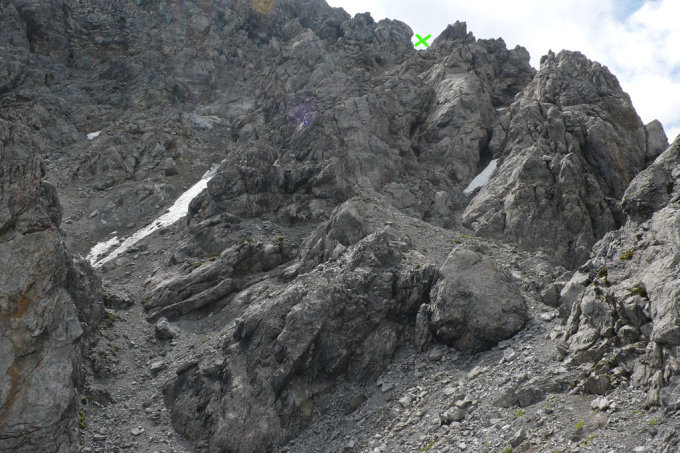 Im erwähnten Führer heisst es unter der Route 245, dass man vom S-chalambert Dadora südlich absteigt in die Scharte P. 2580. "Der felsige Teil des südlich der Scharte ansteigenden Grates wird westlich bequem umgangen. Weiter auf dem Gratrücken bis zum Gipfelaufbau." Hier wird vorgeschlagen, "die leicht ansteigenden Geröllbänder der Westflanke..." zu benutzen. Wie Bild 1 (aufgenommen an dieser Stelle) zeigt, ist das Gelände nicht besonders übersichtlich. Damit man sicher das richtige Band findet, steigt man nun auf oder neben dem felsigen Grat weiter, bis er sich im Geröll verliert und erreicht ein erstes kleines Sättelchen (Bild 2). Das folgende grosse Geröllfeld (Bild 3) wird an seinem oberen Rand bis zu einem weiteren kleinen Sattel durchwandert. Es folgt nochmals ein Geröllfeld und ein Sättelchen. Nun kann man problemlos nach links zum Grat aufsteigen, entweder mit einfacher Kletterei auf einer Rippe oder strampelnd etwas südlich davon. Der Grat wird wenig nördlich des Gipfels erreicht.