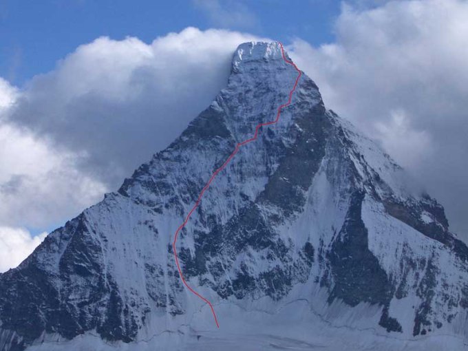 Von der Hörnlihütte zum Einstieg des Hörnligrats (P.3279), um von dort der Wand entlang ca. 60hm auf den Matterhorngletscher abzusteigen. Bei der offensichtlichen Schwachstelle über eine kurze Stufe hoch auf das obere Plateau dieses Gletschers. Man traversiert ca. 500m nach Westen, überquert den Bergschrund und steigt das grosse Eis-/Firnfeld nach oben, wobei man sich nicht nach links drängen lassen soll.
