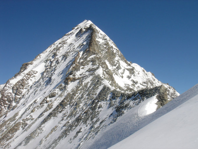 Tolle Route über prächtigen Fels:Gleich links hinter der Cabane Cabane de la Dent Blanche Blanche hinauf über Geröll. Nach ca. 20 Höhenmeter aber wieder rechtshaltend über der Hütte zu Steinmann Queren der über dem WC-Häuschen steht und von da aus auch gut sichtbar ist. Ab hier den nun gut sichtbaren Steinmännern und Wegspuren zum Beginn eines Felsgrates folgen der an den Gletscherrand führt. Über ihn auf die Wandfluhlücke 3705m. Nun dem Südgrat folgen (Achtung: vor allem im Bereich Pt. 3882m beachtliche Wächten auf der Zermatter-Seite) bis man auf ca. 4000m an den Fuss des grossen Gendarms stösst. Hier bieten sich zwei Möglichkeiten:a) Vom Sättelchen am Fuss des Gendarms wenige Meter auf der Hérens-Seite absteigen, nun ca. dreissig Meter horizontal Queren zum Beginn eines seichten Couloirs. Im Couloir hoch bis in den Sattel hinter dem grossen Gendarm. Im unteren Teil des Couloirs findet man auf der orographisch linken Seite Bohrhaken-es ist auch möglich auf eine Rippe auf der orographisch rechten Seite höherzusteigen. In der oberen Hälfte des Couloirs helfen drei gut sichtbare Eisenstangen bei der Sicherung. Vorteil a): Schneller als b) aber objektiv gefährlich!b) Der grosse Gendarm kann auch direkt überklettert werden (IV+).Hinter den Gendarm wieder dem plattigen Grat nach folgen, der erste ausgeprägte Gendarm nachher wird auf der Zermatter-Seite über blockige Bänder und eine Rinne umgangen. Wieder am Grat angelangt stösst man bald auf einen zweiten ausgeprägten Turm. Seinen ersten Absatz DIREKT erklettern auch wenn es von unten logischer erscheint ihn in der Hérens-Flanke zu umgehen (oben befinden sich BH bzw Abseilstelle). Erst wenn man den ersten Absatz erklommen hat über plattige Bänder nach links Queren (Drahtseilschlinge)und weiter linkshaltend (BH) unter dem oberen Teil des Turms durch, der Grat wird im AUFSTIEG erst wieder dahinter betreten. Im ABSTIEG jedoch wird der Grat bis zum Gendarmen-Gipfel gefolgt, hier befindet sich eine gut eingerichtete Abseilstelle die 20m nach Westen hinunter zur erwähnten Drahtseilschlinge zurückführt.Ab hier bietet der Grat keine nennenswerten Schwierigkeiten mehr und führt luftig zum Gipfel.