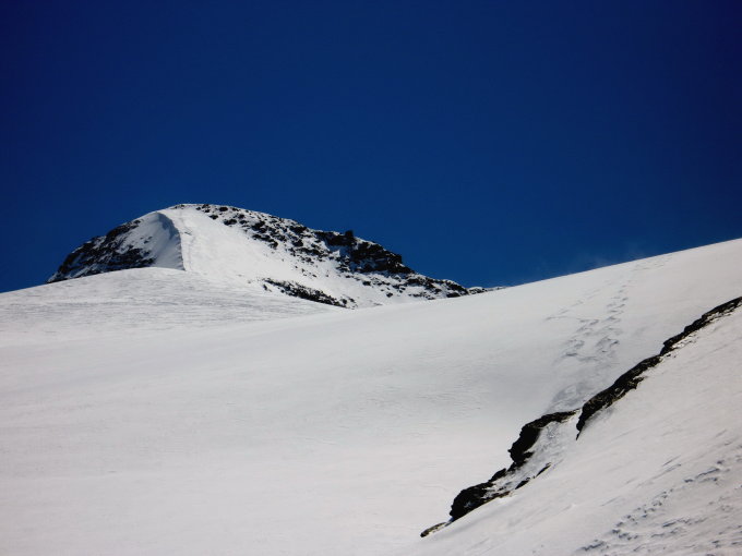 Steigeisen können am schmalen Firngrat zwischen Skidepot und Gipfel hilfreich sein.