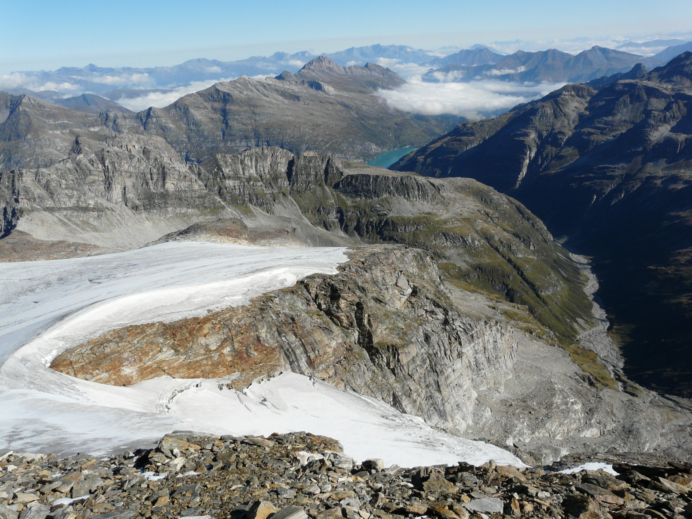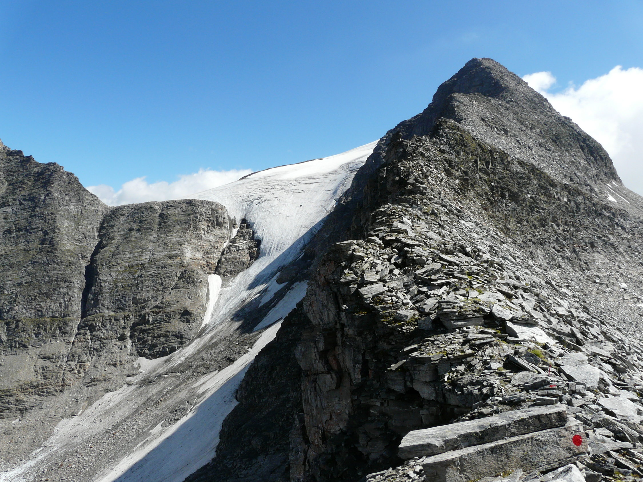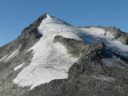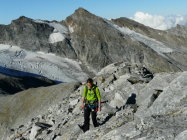 Die Route steigt nun weiter nach Südosten über gut eingewachsenes Geröll an und wechselt östlich von P. 2388 in Grashänge mit guten Trittspuren. In 2600 Metern Höhe wird die nördliche Seitenmoräne des westlichen Güfergletschers erreicht, über die auf deutlichem Weg bis zum grossen Steinmann in 2780 Metern Höhe aufgestiegen wird. 1 h (ab Hütte 2 h). Ein roter Pfeil weist nun nach Süden auf den flachen Gletscher hinaus, den man horizontal in einen schwach ausgeprägten Geröllsattel auf der gegenüberliegenden Seite quert (kleiner Steinmann). Nun auf deutlichen Wegspuren den Schutthang zu P. 2902 hoch, wobei zwei wenig hohe Felsstufen mit Ketten gesichert sind. 1 h (ab Hütte 3 h).