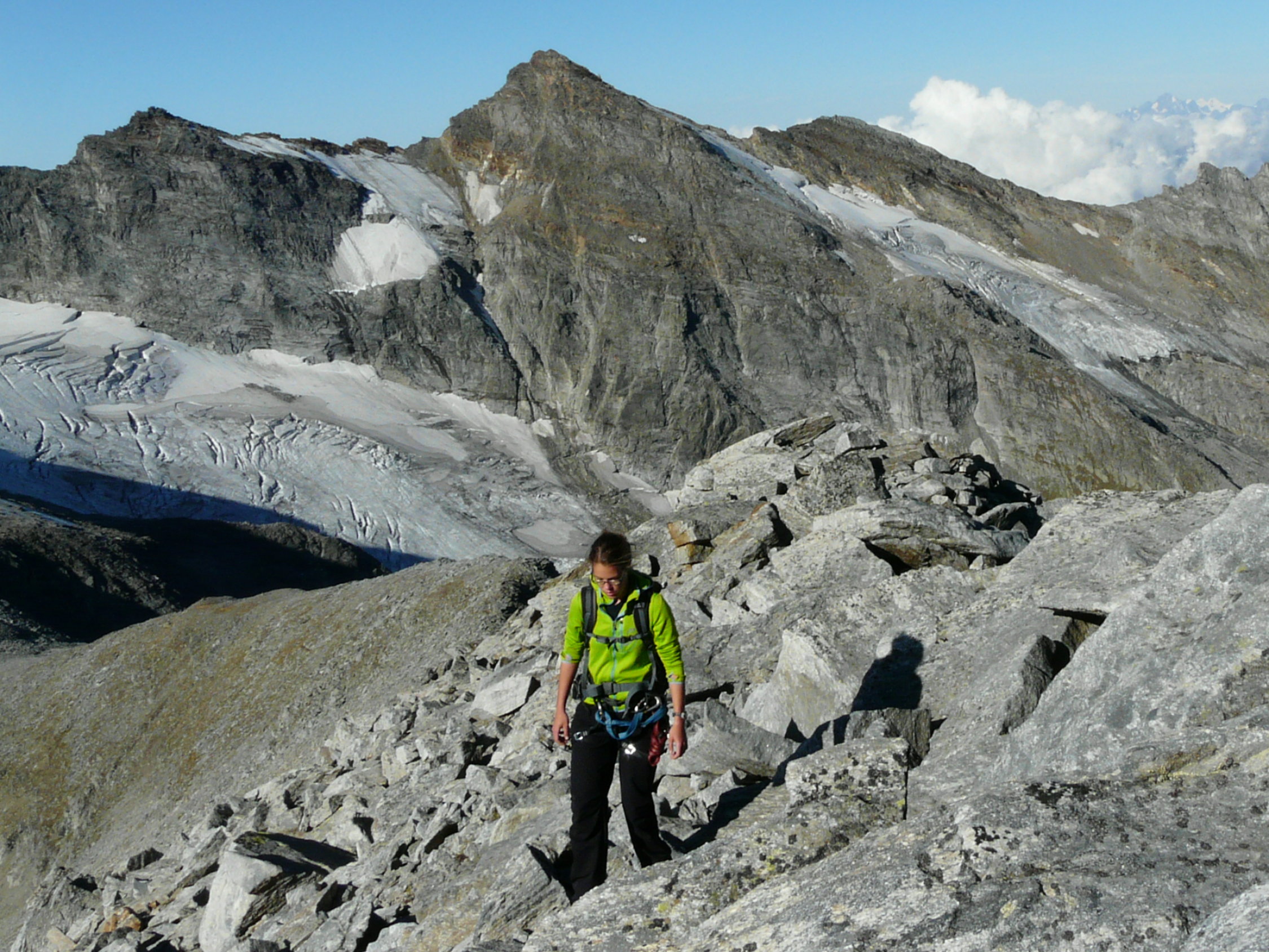 Von dort immer dem Westgrat folgend, vorbei an den Schultern P. 3125 und P.3332, auf den 3379 Meter hohen Gipfel des Güferhorns. 1 h (ab Hütte 4.5 h).