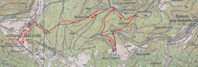 Von Rimbach-près-Guebwiller (550m) folgt man dem kleinen Strässchen talaufwärts bis zur Glashutte (834m; Parkplatz und Naturfreundehaus). Hier starten mehrere markierte Wanderwege auf den Grand Ballon. Man folgt den rot-weissen nach Norden durch tiefen Wald zum Col de Judenhut (978m). Anschliessend wendet man sich nach Westen und steigt weiter hoch durch den Belchenwald (alles Markiert). Auf 1240 kommt man zur Talstation eines Skiliftes. Man folgt dort aber am Besten weiter den Markierungen und kommt so zum Pass der Hochvogesenstrasse und weiter zum höchsten Punkt mit der Radarstation.