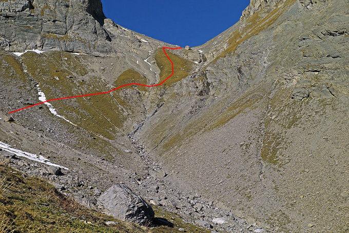 Von der Hütte im Gelbberg steigt man hie und da vorhandene Pfadspuren und Grasflanken nutzend auf der westlichen Seite des Baches das zwischen Drachenberg und Vättnerchopf eingebettete Gelbbergtäli empor bis in den obersten Schuttkessel.