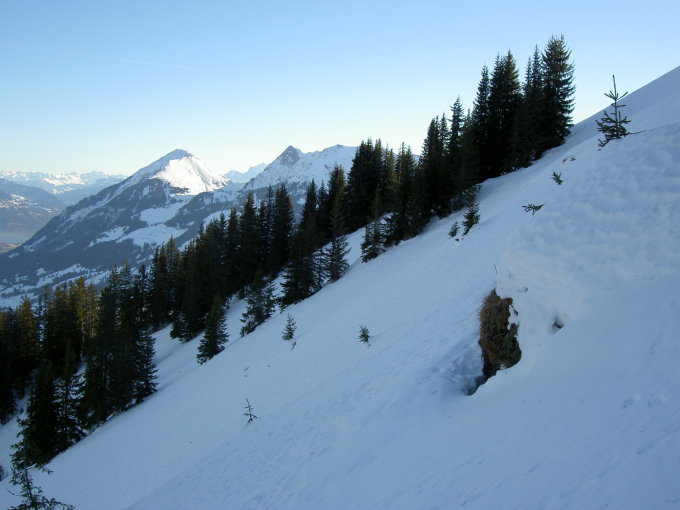 Oestl des Gipfels in die Felszone etwa auf 1900m einfahren und enges Couloir zw. Felsen über Littei nach Feldmöser usw.
