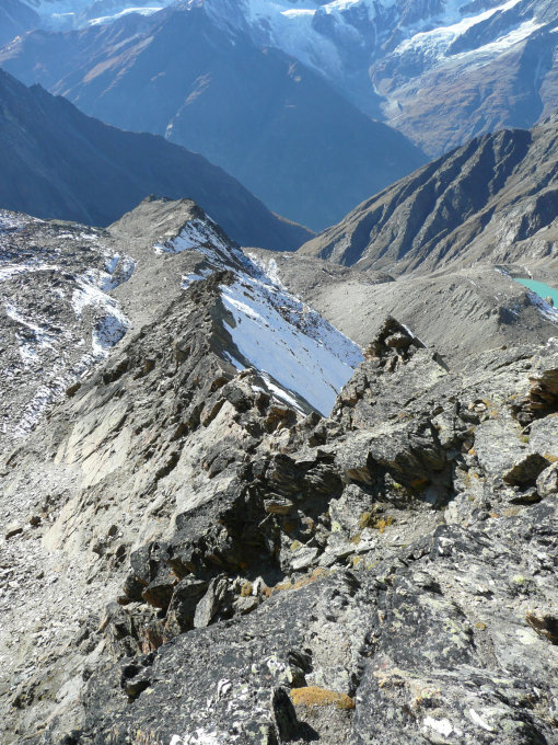 Hier beginnt nun der schwierigere Teil der Kletterei. Gleich zu Beginn bewegt man sich entlang von Bändern und Rissen leicht ansteigend nach rechts, bis man die Gratkante erreicht (ca. 2 SL bis zur Gratkante). Die erste Seillänge durch die Platten ist wohl mit Bohrhaken versichert aber auch sehr anspruchsvoll (eher 5a als 4b), v.a. bei Nässe oder Eis. Von hier aus folgt man dem Grat gerade aufwärts. Hier sind über mehrere Seillängen die Standplätze mit einem Bohrhaken ausgerüstet. (Nur 4). Man folgt immer mehr oder weniger der Gratkante, die logische Linie folgt dem kompaktesten Gestein bis man über einen Turm zu den letzen Felsen gelangt. Diese bieten nochmals mehrere Seillängen plattige Kletterei (III, 1 Bh). Der letzte, senkrechte Turm kann relativ einfach aber sehr exponiert rechts über ein Band umgangen werden, oder recht über das höchste punkt geklettert wurden (4c-5a passage). Am Ende des Bandes über einfache Felsen hochklettern und man erreicht Pt. 4165. Nun über den einfachen Schneegrat zum Gipfel (4206 m).