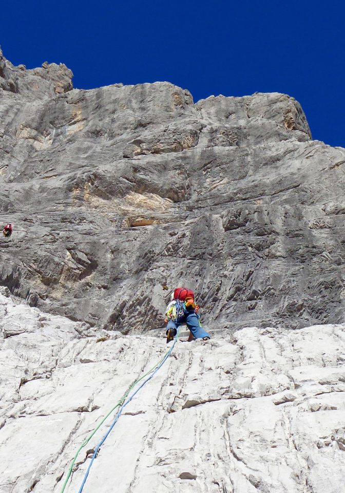 SL 11 (42 m, 6+): Tolle Sportkletterei an dichten Bh an steiler Schlitzwand. Crux sind die ersten 2 m. Wenn man die ersten 4 m geschafft hat geht es klar und griffig nach oben (insgesamt 10 Bh, die mittleren möglichst lang einhängen). Oben ist es etwas grobbrüchig, aber trotzdem unproblematisch und vergnüglich zu klettern. Stand an Kette.