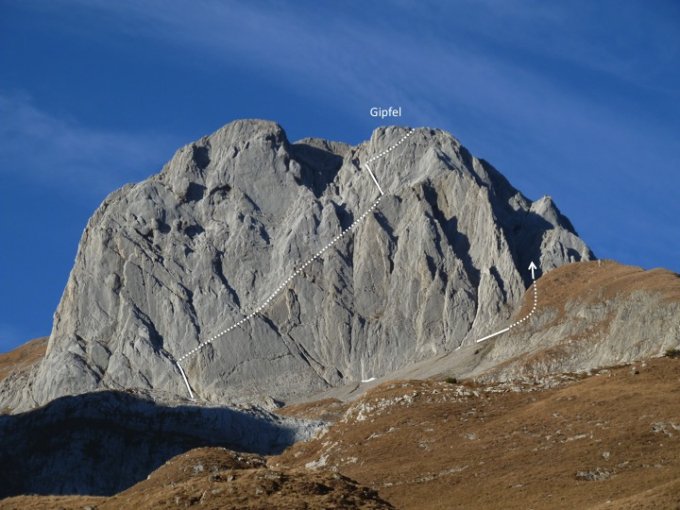 Aufstieg: Schaffhauser Kamin; Abstieg: Südkamin (Routenverlauf siehe Foto). Beide Routen Stellen 2a, meist 1, gelegentlich auch Gehgelände (Bewertung aus dem SAC Kletterführer Alpstein, Auflage 2011; die Schlüsselstellen könnten aber ohne weiteres auch mit 2b bewertet werden).