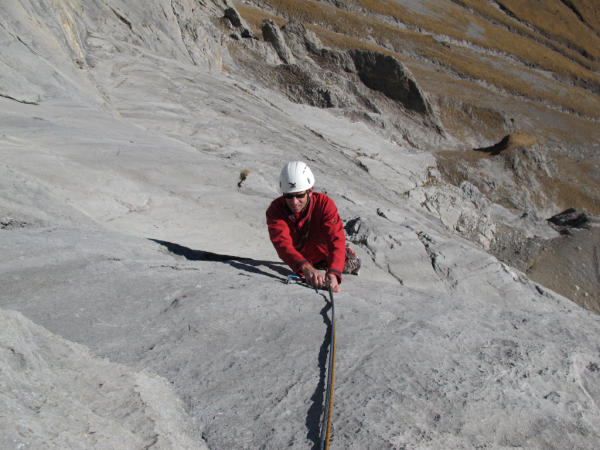 Erste 4-6 (je nach Variante) Seillängen über den Westgrat. Abseilen auf die Sonnenterrasse. Entlang der Wand zirka 50m aufwärts zum Einstieg "Graue Platten".