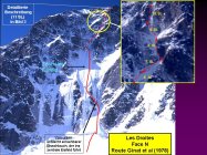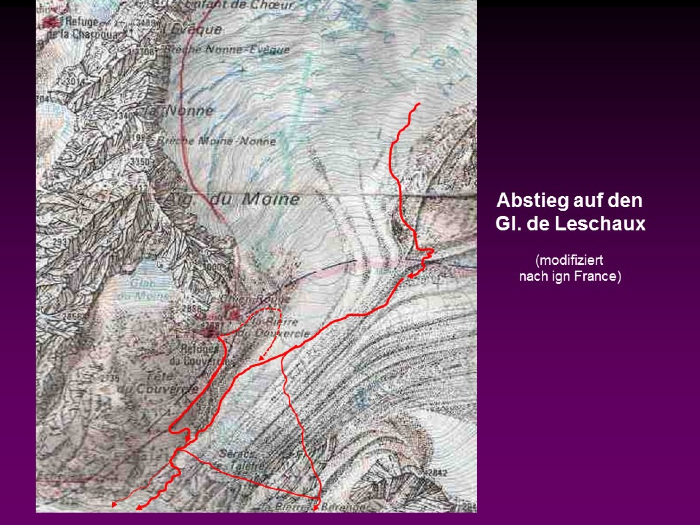 b) im Winter und Frühjahr (? Herbst) bei hoher Schneelage durch eines der Couloirs, die südlich der Hütte auf das Mer de Glace bzw. den unteren Teil des Gl. de Leschaux hinunterziehen. Dazu muss man von der Hütte zunächst entlang dem Sommerweg leicht fallend in SW-Richtung absteigen bzw. mit Ski abfahren, bis man nach links (SO) vom Sommerweg abbiegt (Vorsicht: nicht zu weit nach SW absteigen!), einen kleinen Grat überschreitet (Markierung durch Stangen) und dann in einer kurzen Schleife nach NO zwischen großen Felsplatten hindurch den Talboden unter der Hütte erreicht.