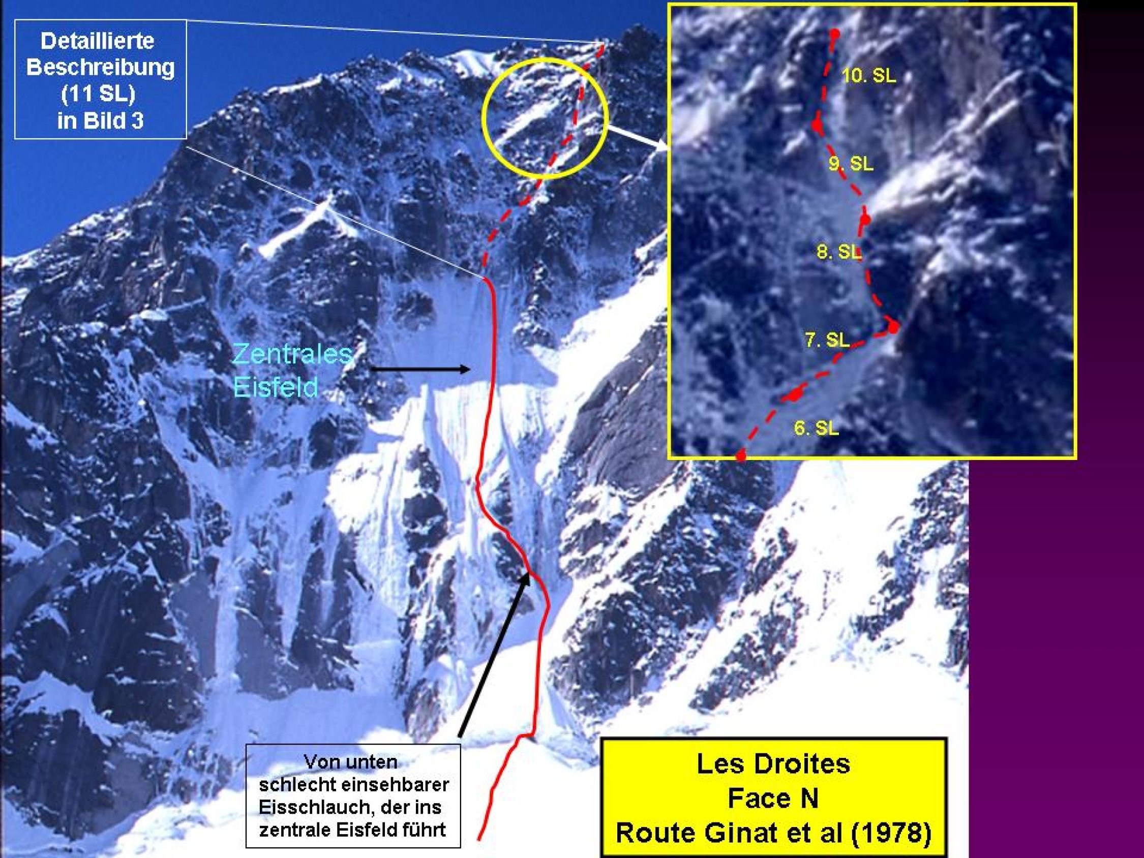 Bergschrund meist relativ weit rechts i. S. des Aufstiegs überwinden. Dann entweder gerade hinauf (da wahrscheinlich schwieriger, eher nur bei guten Verhältnissen) oder (wie am 24.05.2010) rechts haltend das Firnfeld im Trittschnee soweit hinauf, bis sich an dessen Ende links – von unten schlecht einsehbar – ein ins zentrale untere Eisfeld führender Eisschlauch (Messner-Rampe) öffnet. Durch diesen (z. T. ca. 70°, auf der linken Seite des Eisschlauches 2 Haken im Fels) auf das zentrale Eisfeld und in Firn bzw. Blankeis bis unter die Zone des kombinierten Fels- und Eisteils mit dem Beginn der Schwierigkeiten. Ab hier, zunächst in die mittlere Eisrinne einsteigend, insgesamt etwa 11 Seillängen (50 m Seil) hinauf; die letzten 80-100 Höhenmeter bis zur Breche oft Firn (45-50°). Details für die 11 SL s. Topo, Bild 3.