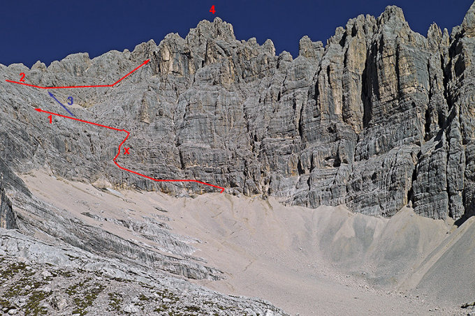 In Sichtweite des Bivacco Slataper verlässt man den Pfad rechts haltend ins Schuttkar Fond di Rusecco. Über dessen grosse Schutthalden steigt man auf Pfadspuren ziemlich mühsam und anstrengend hoch zum Einstieg ins untere Felsband der Südostflanke.