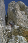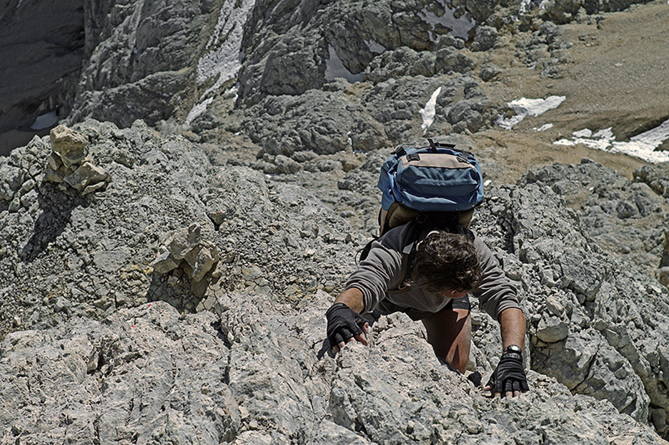 Aus dem Band durchsteigt man anschliessend über Schrofen und leichte Felsstufen direkt westlich der Punta Sorapiss die Wand im oberen Teil bis zur Grathöhe, von der man einen eindrücklichen Tiefblick zum Ghiacciaio Occidentale geniesst.
