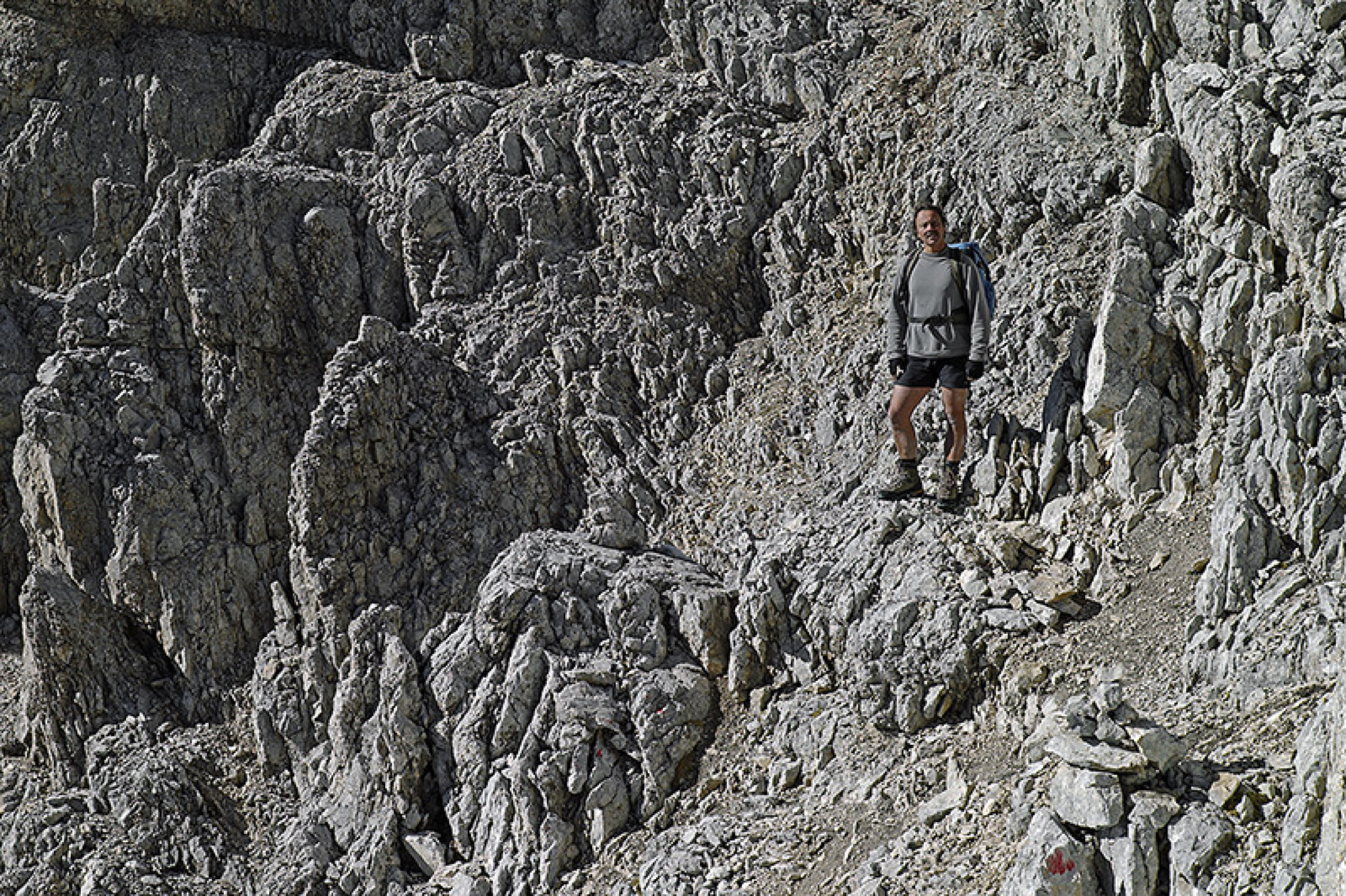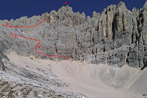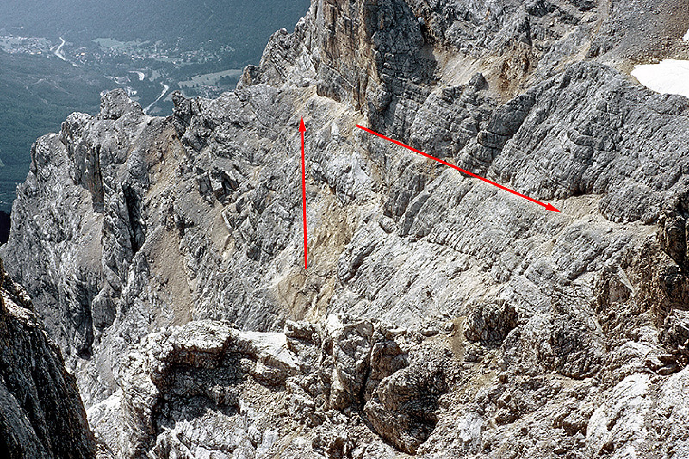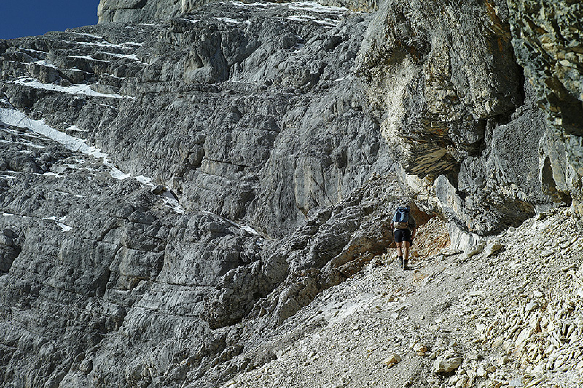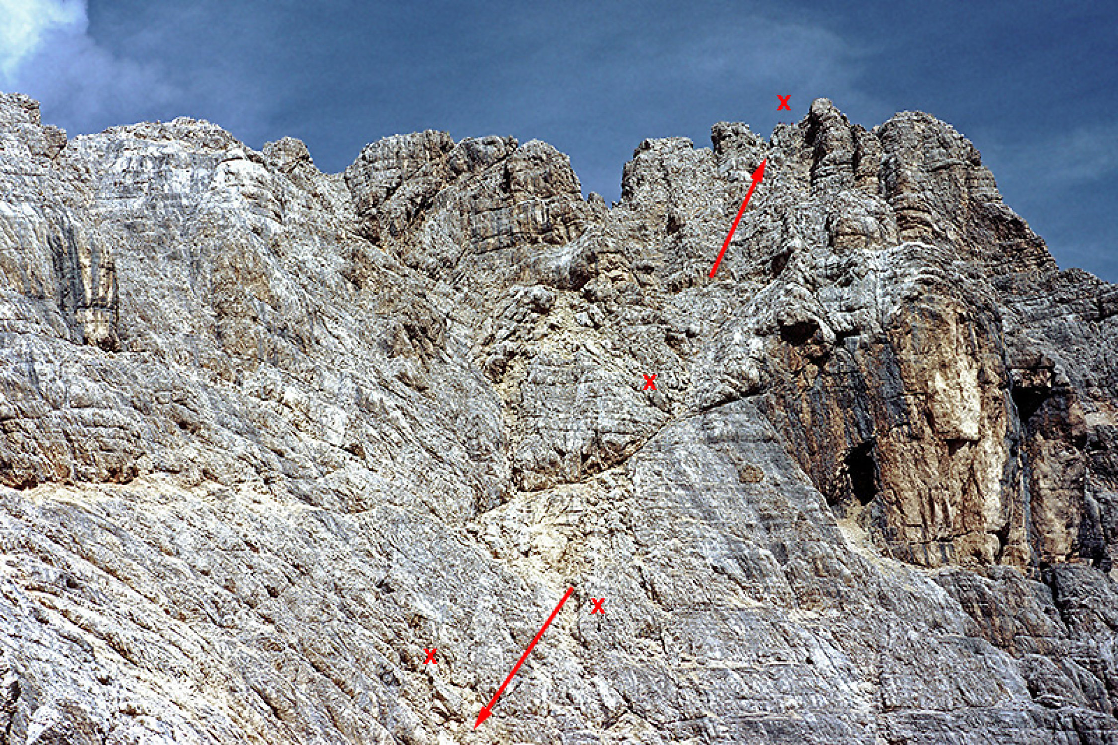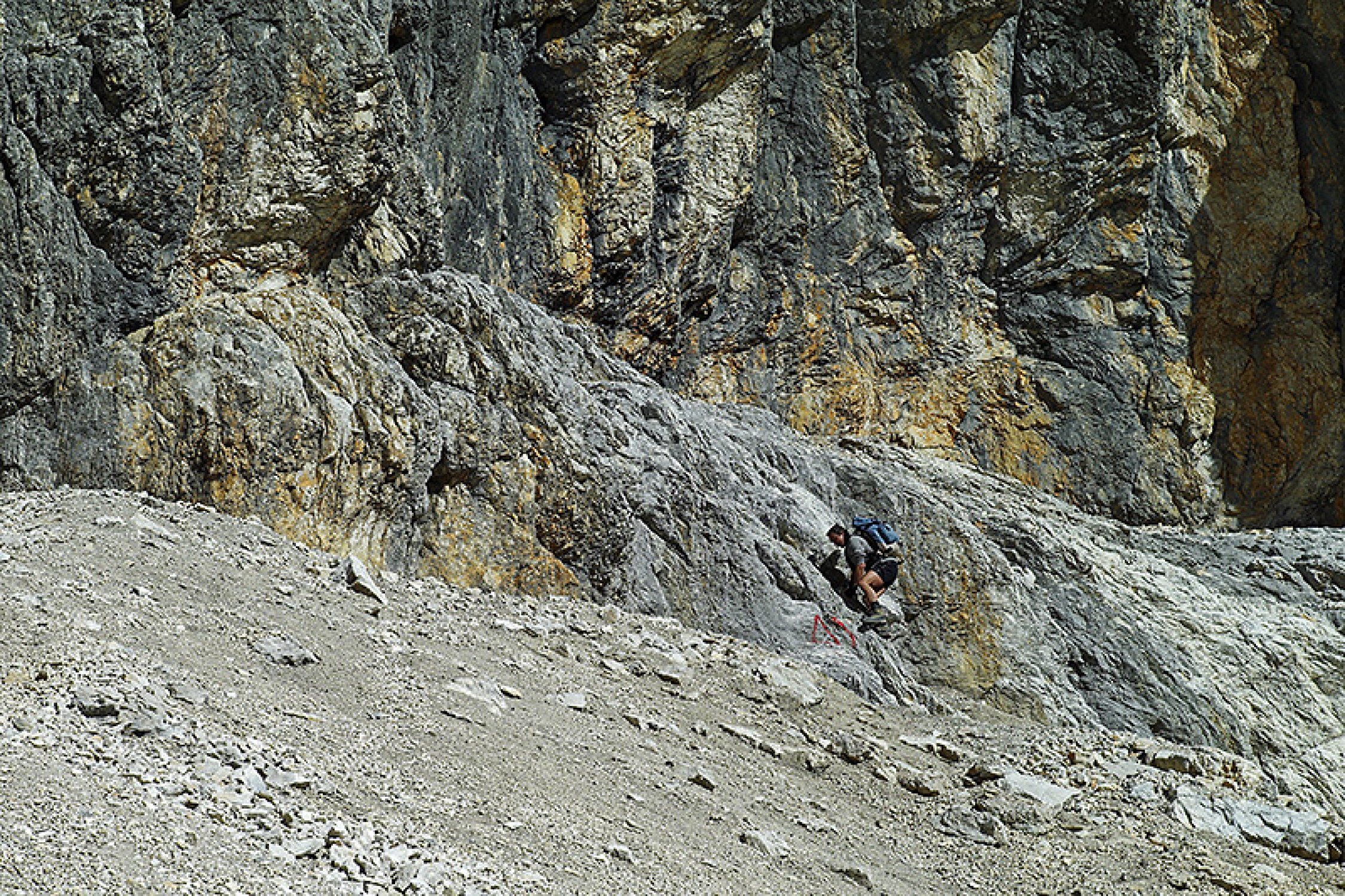 Im Mittelteil des Aufstiegs quert die Originalroute über Schutt und Schrofen ansteigend ziemlich weit westwärts Richtung Croda Marcora, bis direkt unterhalb deren Gipfelwände ein Band zur Punta Sorapiss zurückführt.