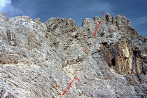 Dieses obere Band lässt sich alternativ auch an diversen Stellen in direktem Aufstieg über Schutt oder brüchigen Fels erreichen. Dies kann im Herbst von Vorteil sein, wenn unterhalb der Gipfelwände der Croda Marcora (Südostlage anstelle Südlage) Hartschnee liegt