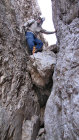 Direkt oberhalb des Klemmblocks der Schlüsselstelle ist eine Abseilstelle eingerichtet, die man aber eigentlich nicht benötigt. Sonst finden sich auf der gesamten Route keine Versicherungen.