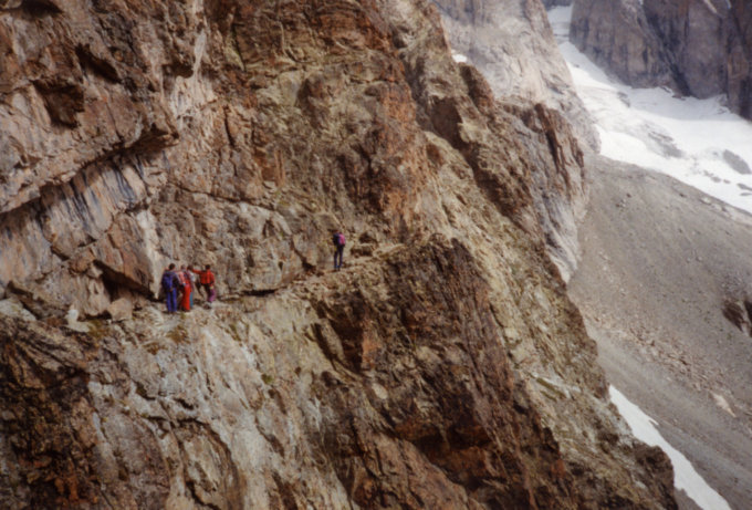Vom Refuge du Sélé über Geröll und Felsstufen zum Glacier du Coup du Sabre. Der vom (O-)Gipfel herunterziehende S-Grat wird überquert und einem ausgeprägten Band ziemlich horizontal durch die S-Flanke gefolgt. Das Band ist an einer Stelle unterbrochen-hier einige Schritte etwas abdrängendes IIer-Gelände. Über Geröll und Firn gelangt man zum Ost-Gipfel.