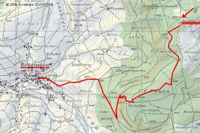 Vom Dorfplatz Beggingen nimmt man die Strasse die genau richtung Osten geht und erreicht so über Flurwege 100Hm oberhalb des Dorfes P.647m am Waldrand. Hier zweigt man in den schlechten Forstweg der rechts den Wald hochführt. Nach 400m biegt man nach rechts auf einen besseren Forstweg auf dem man 200m weiter zu einer Kreuzung geht. Von der Kreuzung muss man nun der Forstrasse folgen die nach Norden leitet (etwa 330° Wendung). Nach 300m erkennt man ein kleines Fussweglein das rechts steil zum P.879,5m (Ob Lucken) leitet. Auf breiten Forstwegen über den Uf Neuen (898m) und P.889m erreicht man so den Hagen mit seinem Aussichtsturm. Der höchte natürlich Punkt vom Hagen liegt etwa 80m nördlich vom Turm im Wald versteckt.