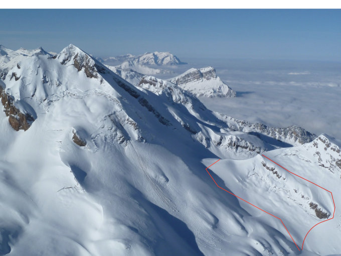 Richtung Rotenbalm abfahren bis Chüebödmer ca. 1890m. Entweder direkt den steilen (ca. 35°) Hang zum Firtiggrätli empor oder eleganter und sicherer nördlich des markanten Felsbandes südlich des Dibistock ebendahin ansteigen. Nun den sehr steilen Nordhang, ca. 38°, des Diepen nach Westen queren, bis man das darüber liegende Felsband auf ca. 2060m südlich umgehen kann, um so auf die Schulter ca. 2080m auf der Nordrippe des Diepen zu gelangen.