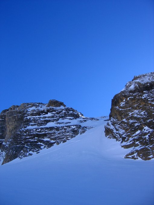 Durch das erste Couloir gelangt man auf den Bächifirn. Das Couloir ist etwa 45 Grad steil und ist je nach Bedingungen auch mit Skiern und Harscheisen zu machen.