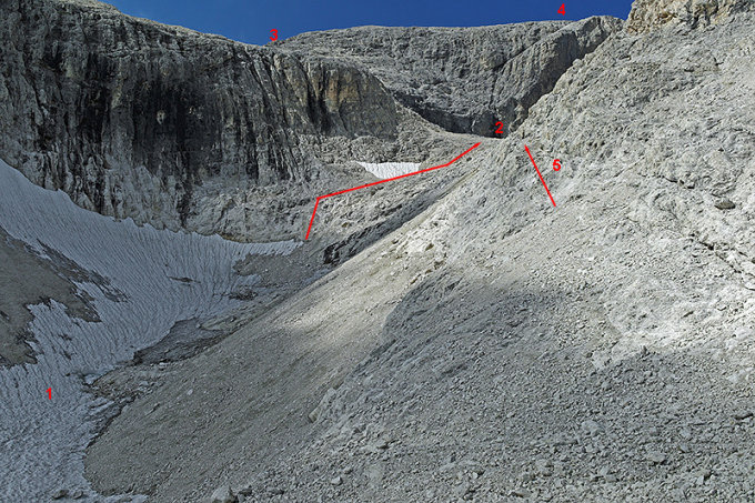 Schwierigkeit: T5, kaum Begehungsspuren, Steinschlaggefahr beachten.
