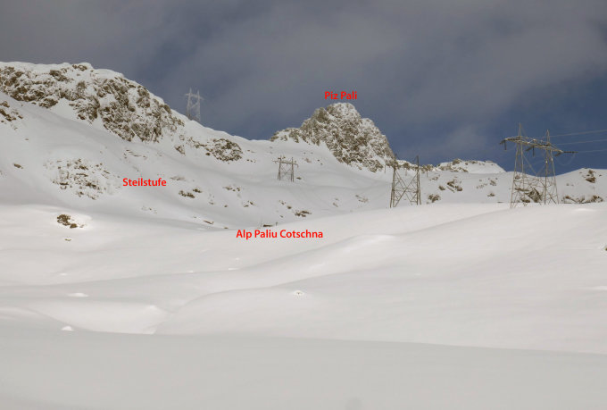 Vom Bahnhof Rueras auf dem Strässchen (Winterwanderweg) oder direkt zu Punkt 1551 und nach Nordwesten ins Val Milà bis zur Alphütte Paliu Cotschna (2215 m). Die Steilstufe im Norden der Alp erklimmt man in einer Linkskurve (links der Hochspannungsleitung) und gelangt so auf die Plaun Grond. In nordöstlicher Richtung quert man unterhalb des Piz Pali durch und erreicht über coupiertes Gelände den Lai Selvadi. Nun steigt man entweder direkt den Hang hoch zum Sattel zwischen den dem nördlichen und südlichen Gipfel (Hang z.T. über 30°) oder links ausholend auf den Westgrat und über diesen zum nördlichen Gipfel (2709 m). Den südlichen, ein paar Meter höheren Gipfel (mit Kreuz) erreicht man aus dem Sattel über den Nordgrat (zu Fuss).