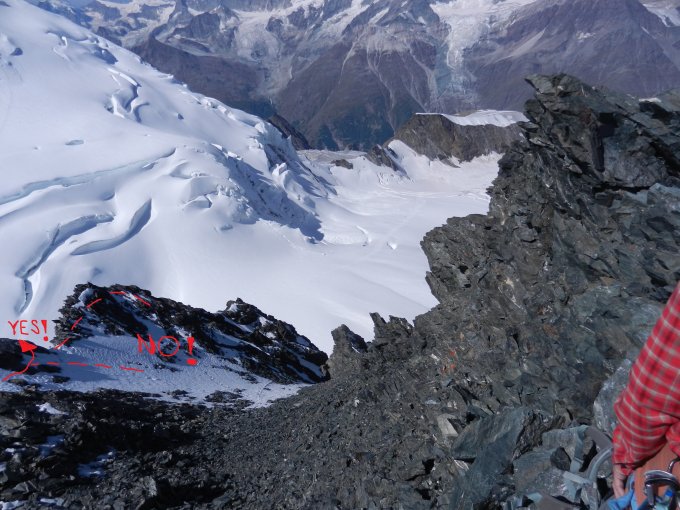 Legt man sich hier auf die Brüstung der Rippe, MUSS der markante S-Grat Gendarm im weiteren Gratverlauf nach Süden hin sichtbar sein, vom Gipfel her ist er es NICHT.