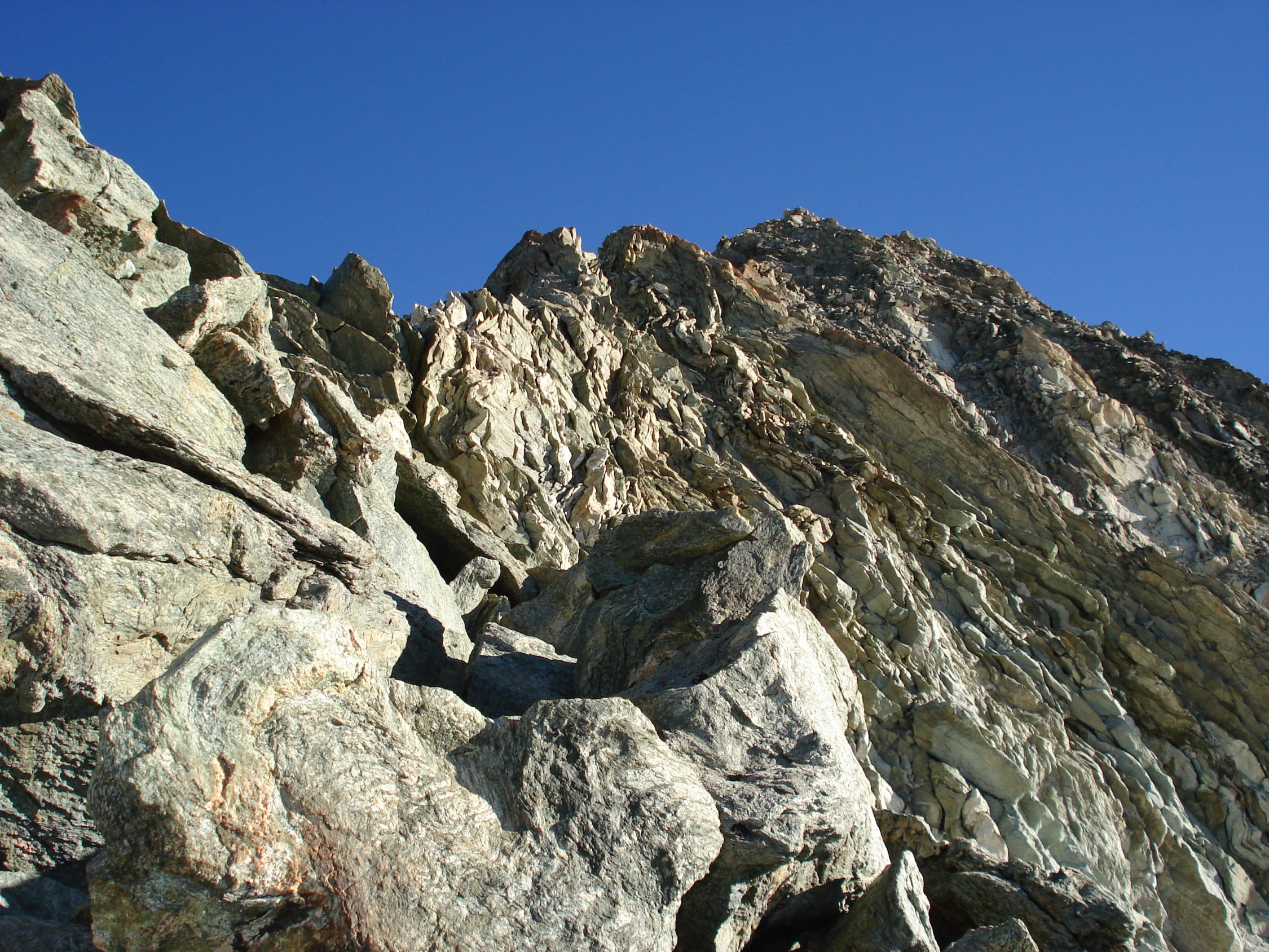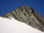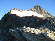 Ab Pt. 3470 kann entweder auf dem Gletscher zum Fuss der Gipfelfelsen aufgestiegen werden (schneller) oder auf dem blockigen Grat.