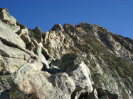 Die letzten 150HM müssen nun über den Gipfelgrat erklettert werden. Hier sind ein paar luftige Stellen im -III Grad zu bewältigen. Es finden sich Felszacken oder Ritzen zum Sichern mit Schlingen oder Friends.